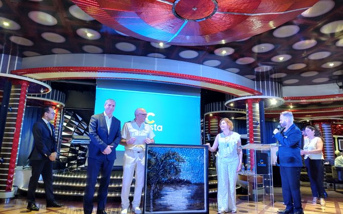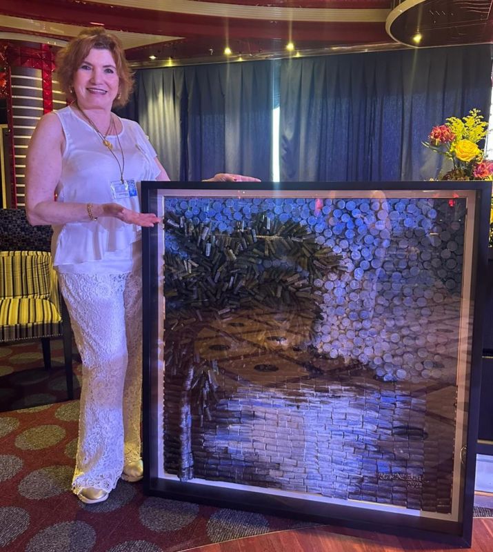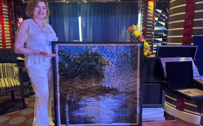 Durante o evento, o Costa Pacífica recebeu a obra “Uma nativa praia, Balneário Camboriú”, da artista Arlene Delatorre, de 73 anos. Feita com rolhas coletadas na praia Central, a peça carrega uma mensagem de sustentabilidade. “A ideia é conscientizar as pessoas sobre a preservação dos oceanos. Espero que a obra inspire cuidado com o planeta”, disse a artista.