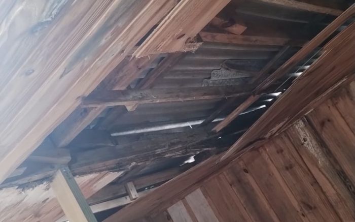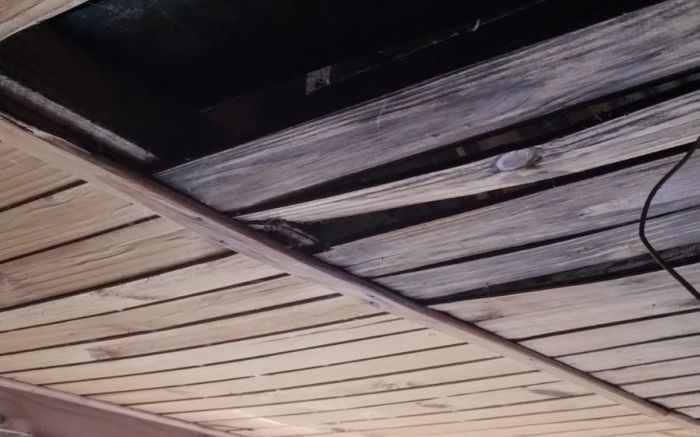 Infiltrações causaram danos no telhado, comprometendo a estrutura de sustentação do forro de um dos quartos e da cozinha. O apodrecimento também afeta o assoalho, que está cedendo em alguns pontos. Além disso, vários locais da casa estão infestados por cupins e brocas, e a fiação elétrica é precária.