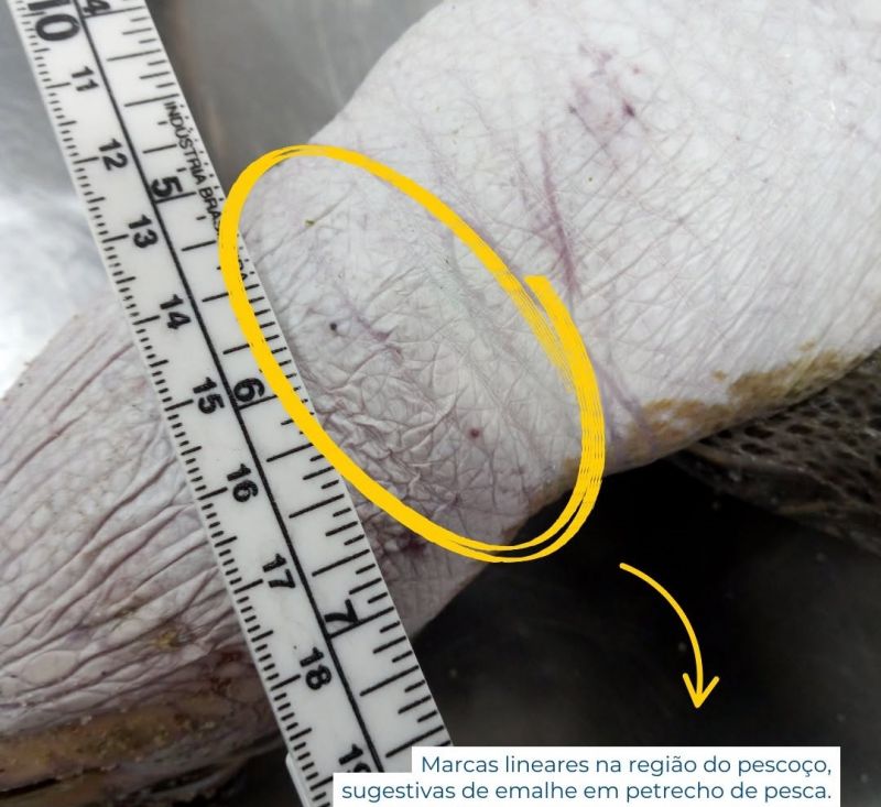 Marcas que seriam de redes de pesca foram identificadas nos animais (Foto: Divulgação/Univali-Penha)