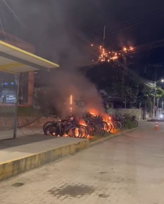 Parte da praça Nossa Senhora das Graças, a do bairro Matadouro, em Itajaí, pegou fogo na madrugada desta segunda-feira. As bicicletas que estavam ao redor foram destruídas pelas chamas. O local precisou ser isolado devido ao risco de descarga elétrica.