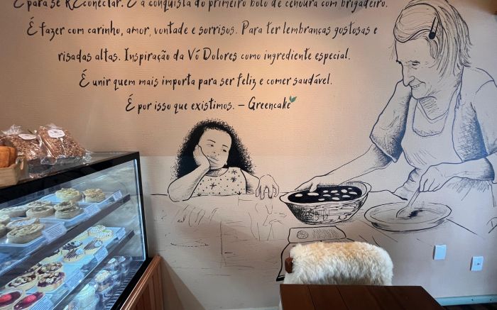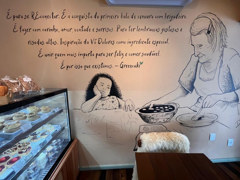 Mais do que sabor, a Green Cake serve memórias. As paredes do espaço são decoradas com frases e receitas originais da avó de Marina, reproduzidas com a caligrafia dela por artistas locais. “Tem receitas do caderno da minha avó na parede do banheiro. São réplicas exatas, com riscos e tudo”, conta Marina.