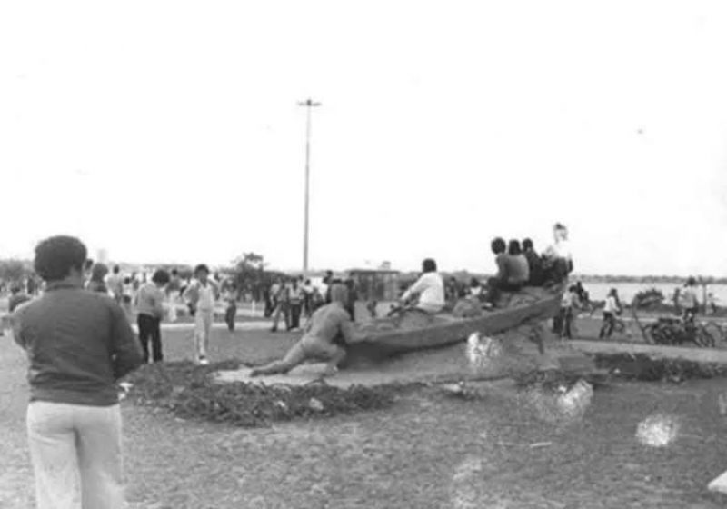 Monumento do pescador na Beira Rio, na década de 1980, representava um homem empurrando uma canoa. Foi retirado após a revitalização da praça nos anos 90 (Foto: Arquivo Público)
