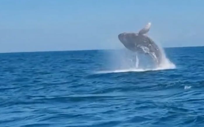 Baleia dá show para pescadores na orla de Balneário Piçarras; veja o vídeo