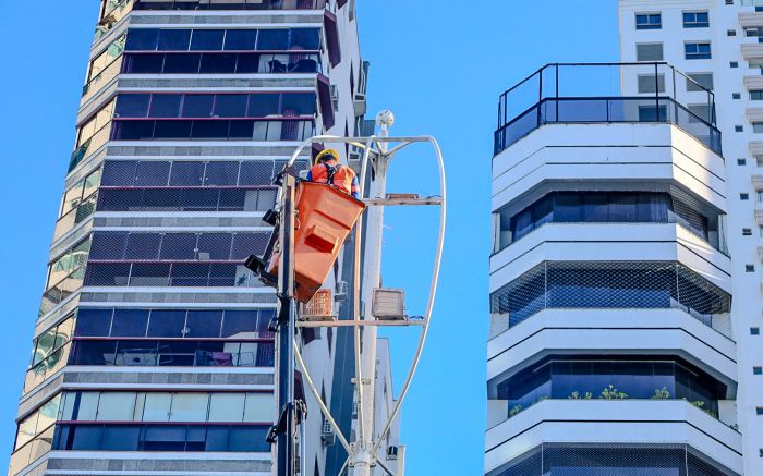 A prefeitura de Balneário Camboriú retomou o trampo de troca dos refletores da iluminação pública da Praia Central. Equipamentos queimados ou com defeito estão sendo substituídos por modelos novos.