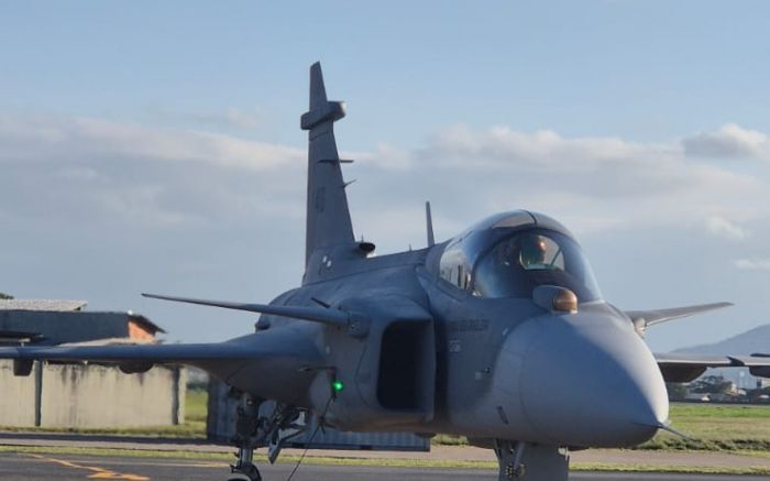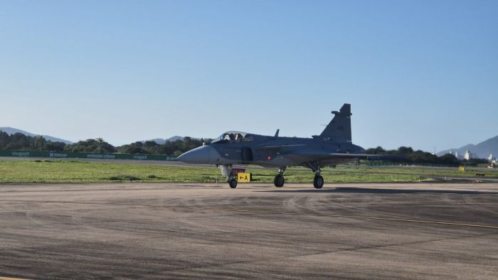 Às 11h20 de terça-feira, o F-39 Gripen, de matrícula 4110, novo caça da Força Aérea Brasileira (FAB), decolou do aeroporto internacional de Navegantes rumo à Base Aérea de Anápolis (Baan), em Goiás, onde será incorporado oficialmente à frota da FAB.