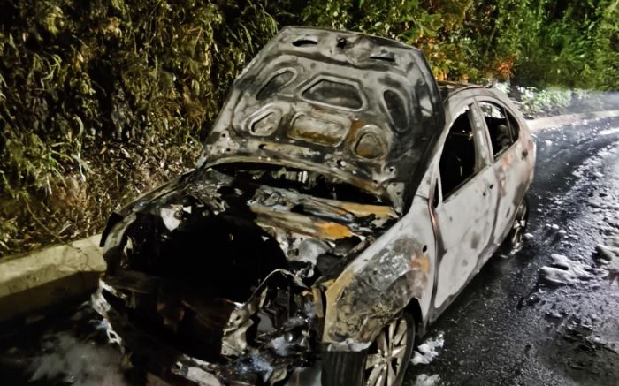 Um carro ficou completamente destruído após pegar fogo na noite desta sexta-feira em Balneário Camboriú. O JAC J3 cinza seguia pela rua Avelon Cordeiro, que dá acesso à BR 101, quando o motor colapsou.