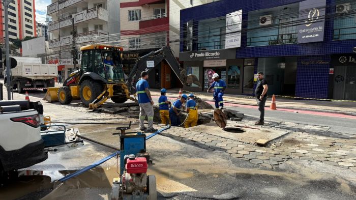 A Emasa acabou a substituição da adutora que rompeu na madrugada deste domingo na avenida Brasil, esquina com a rua 3680, em Balneário Camboriú. O rompimento abriu uma cratera que engoliu dois carros estacionados na via.