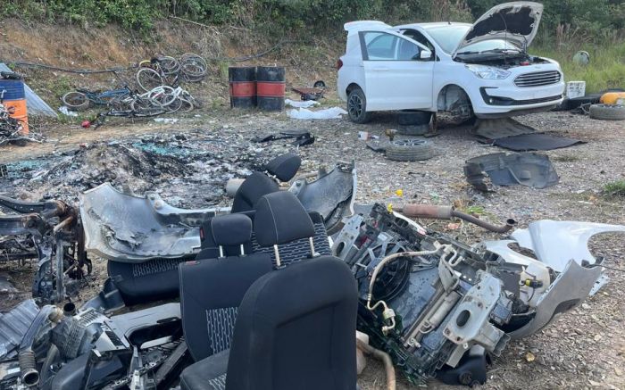 Também havia restos de veículos queimados, peças automotivas diversas e evidências de que o espaço era utilizado com frequência para o desmanche.