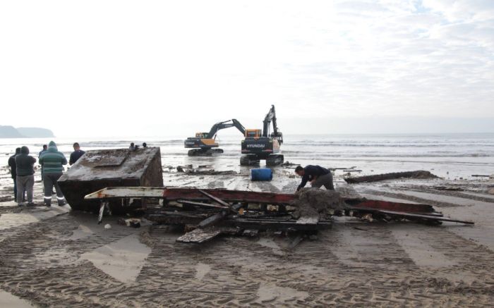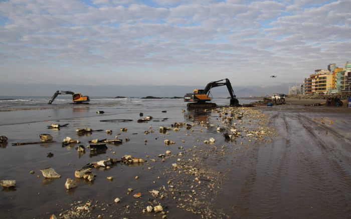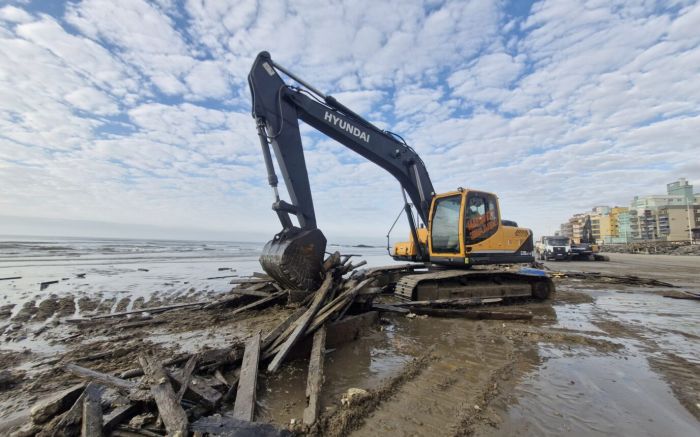 Força tarefa envolveu retroescavadeira, escavadeiras e caminhões na orla da praia