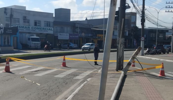 Um caminhão derrubou a sinaleira da avenida Reinaldo Schmithausen, em frente ao Fort Atacadista, por volta das 11h30 desta segunda-feira.