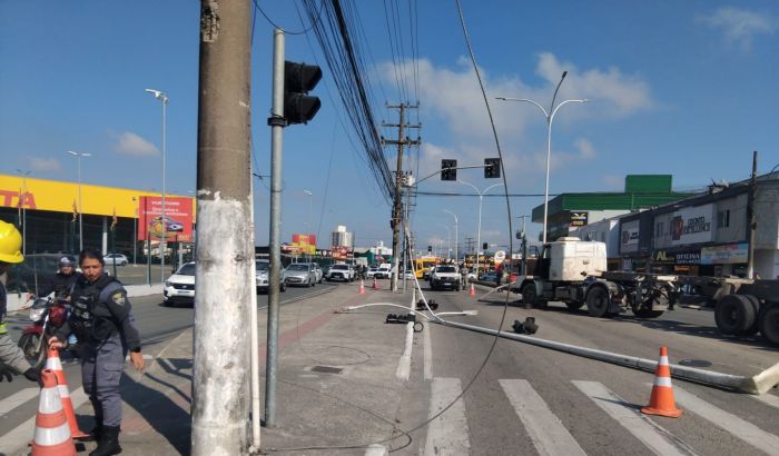 De acordo com a Codetran, o motorista do caminhão tentou desviar de uma moto que teria cortado a sua frente na sinaleira. Ao desviar, o veículo bateu em um poste e derrubou a sinaleira.