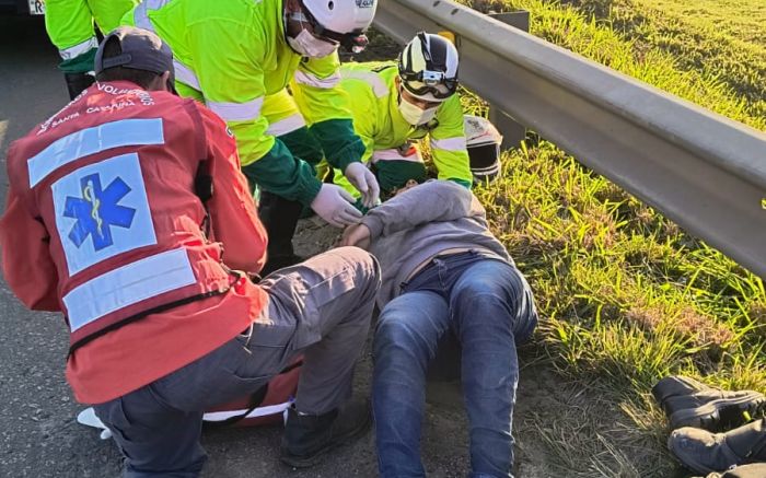 Já às 8h desta quarta-feira, no quilômetro 93 da BR 101, sentido Curitiba, o pneu da moto Biz conduzida por D.R.F., de 21 anos, estourou, e ela sofreu uma queda grave. Um bombeiro voluntário que vinha logo atrás, também de moto e a caminho do trabalho, prestou o primeiro atendimento e acionou a central dos Bombeiros Voluntários.