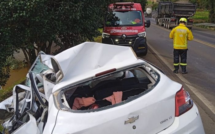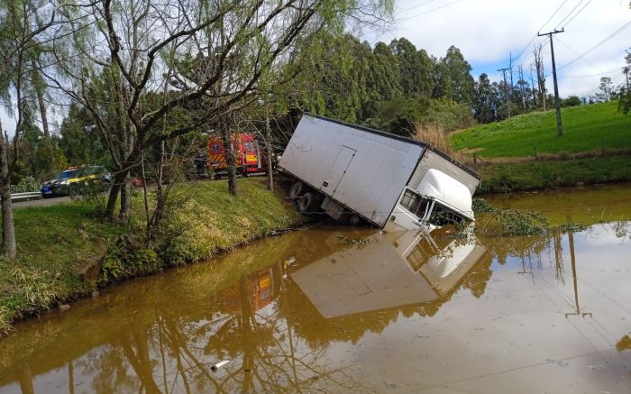 Com o impacto, o caminhão saiu da pista e caiu num açude às margens da rodovia. O motorista e a passageira do caminhão tiveram ferimentos leves e foram levados ao hospital de Joaçaba.