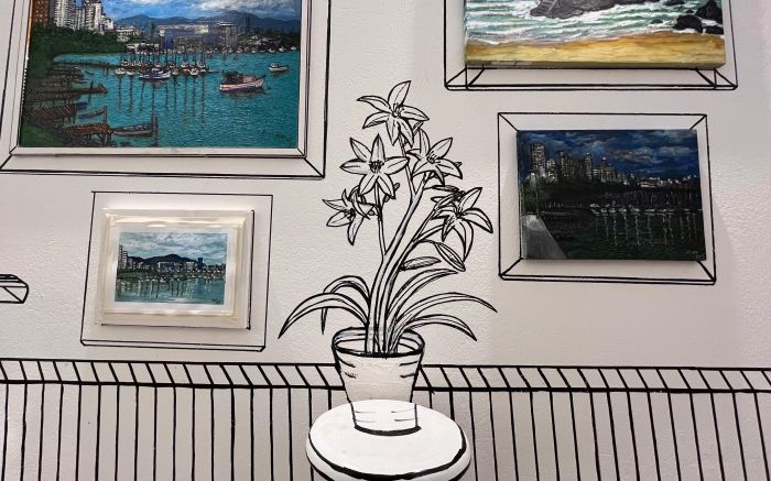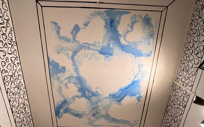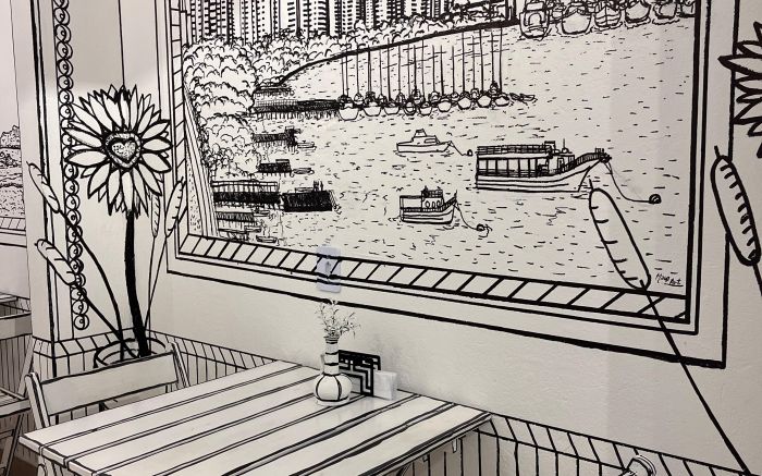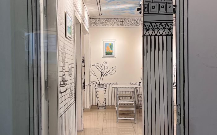 A casa é completamente personalizada. É como se você estivesse entrando em uma ilustração. Do teto ao chão, das mesas aos vasos de flores, cada traço em preto e branco compõe um cenário que parece saído de um gibi. Até o banheiro entrou na brincadeira.