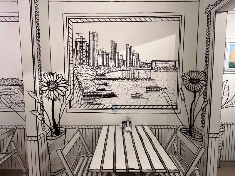 Entre as paredes desenhadas à mão, uma surpresa sensível: as ilustrações que decoram o espaço são, na verdade, paisagens de Itajaí. A pizzaria presta uma homenagem afetuosa à cidade que a acolhe, com desenhos que retratam ícones locais como a Beira Rio, o Bico do Papagaio e a praia de Cabeçudas. Uma forma linda e criativa de valorizar a cultura e a identidade de Itajaí.