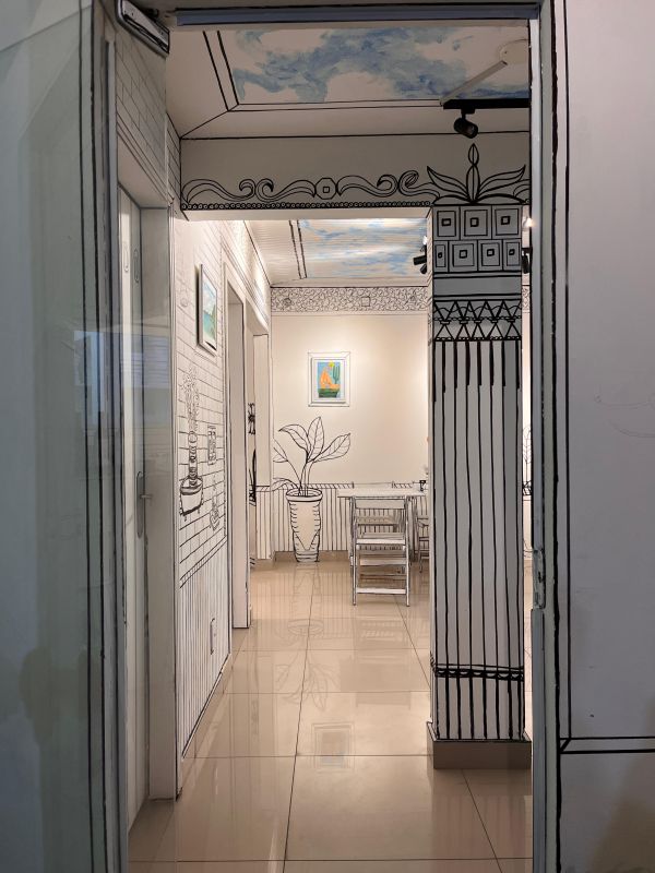 Na Nossa Pizza & Arte, nem os espaços mais íntimos escapam da criatividade. O banheiro — sim, o banheiro! — também foi transformado com traços em preto e branco, seguindo fielmente o estilo da casa. O resultado? Um ambiente divertido, inusitado e totalmente instagramável.