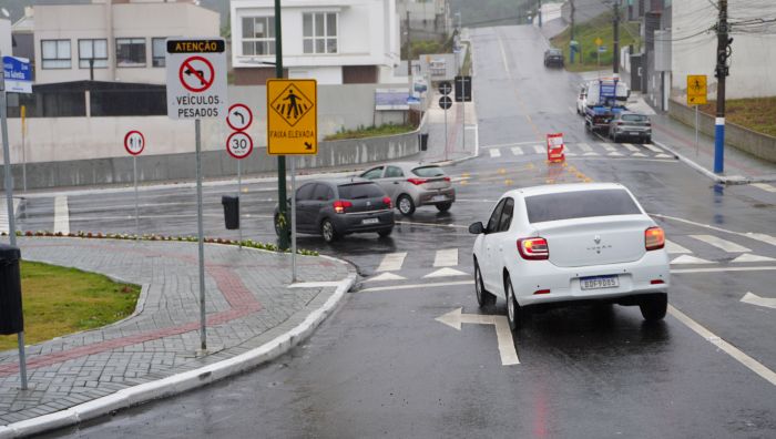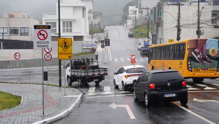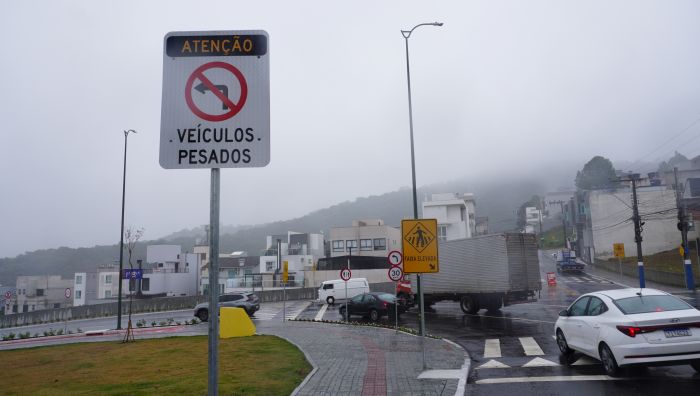 Entre as mudanças no trânsito na ampliação do binário da avenida Martin Luther com a avenida do Estado Dalmo Vieira, em Balneário Camboriú, uma placa na entrada da Martin Luther confunde os motoristas sobre a proibição de acesso de veículos pesados na via.
