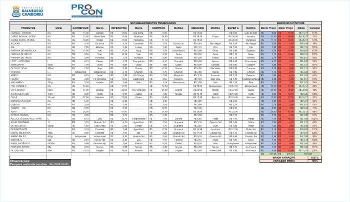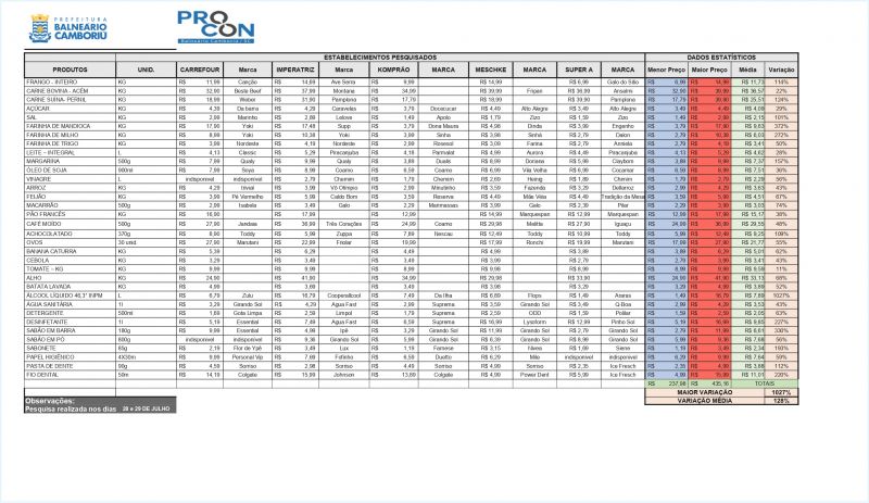 O levantamento foi feito nos dias 28 e 29 de julho em cinco supermercados da cidade (Imperatriz, Carrefour, Komprão, Meschke e Super A) e foi divulgado na sexta-feira pela prefeitura.