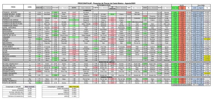 A cesta básica ficou mais barata em Itajaí, com queda de 3% em agosto na comparação com o mês passado, segundo o Procon. Foram analisados os preços de 36 itens em oito supermercados, conforme pesquisa feita na segunda-feira.