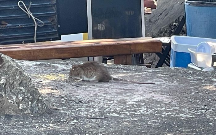 As aves tiveram que se contentar em olhar, enquanto o ratão se esbanjava, sem se incomodar com a presença de pessoas e em ser filmado. Após aproveitar bem a refeição, o roedor correu pra uma toca embaixo das pedras, junto com outra ratazana que também estava à espera. Os animais foram vistos numa área de acesso aos deques, ao lado de um food truck.