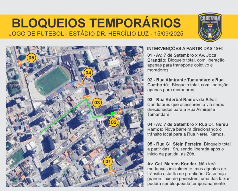 - Rua Gil Stein Ferreira: bloqueio total a partir das 19h, sendo liberada após o início da partida, às 20h