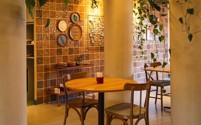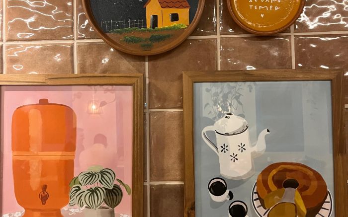 Mais do que uma cafeteria, a Madê foi pensada como uma extensão da casa da vó, da tia querida ou daquela amiga que recebe sempre de braços abertos. A ambientação traduz esse espírito: sofás macios, plantas por todos os lados, quadros, mural de fotos, ladrilhos, livros espalhados e um jardim cheio de charme.