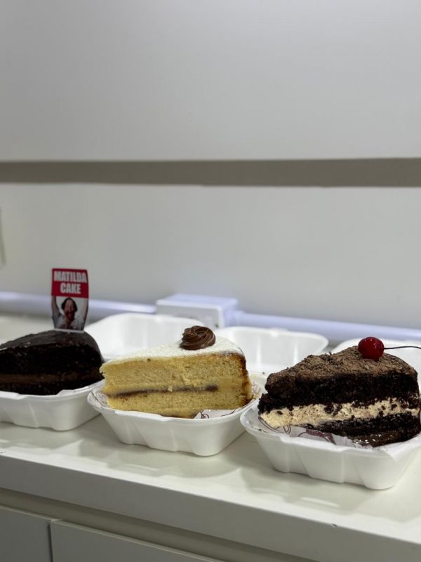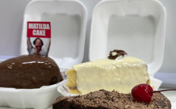 - • Bolo da Matilda (R$ 28): fatia generosa com calda de chocolate servida sem pressa e sem limite.