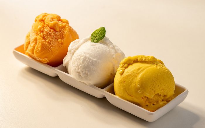 Trilogia de sorvetes tropicais com chips de banana-da-terra e calda de maçã com menta