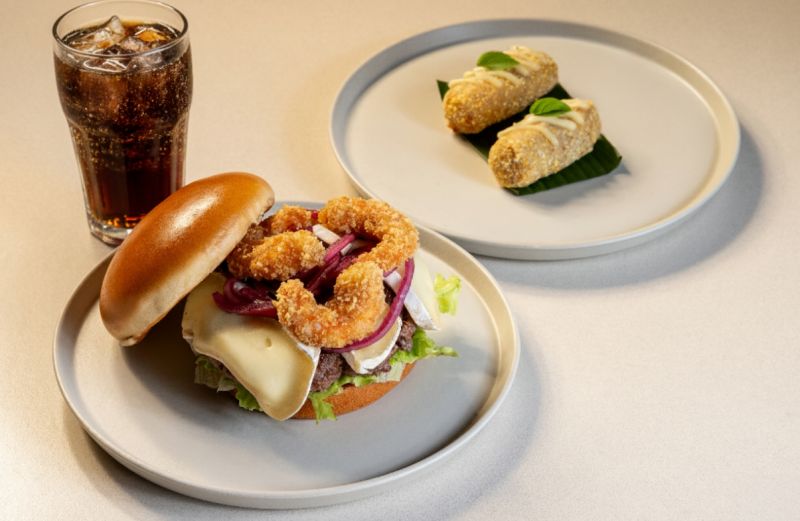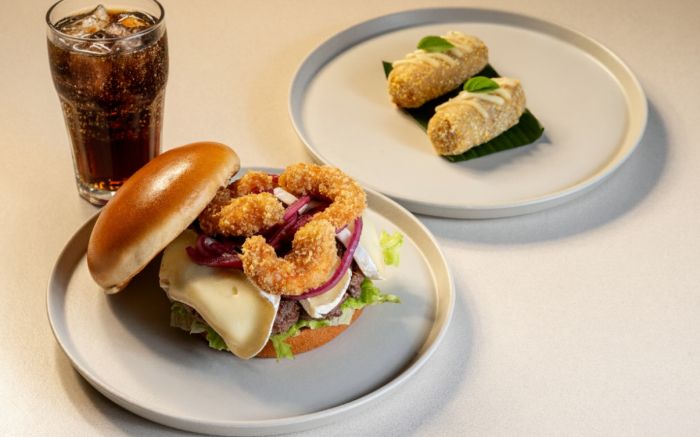 Croqueta de peixe como entrada e hambúrguer com camarão empanado como prato principal