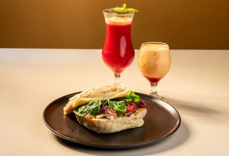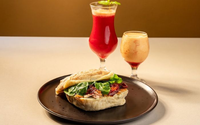Toaste com salmão assado e pesto, sobremesa de papaia e bebida refrescante