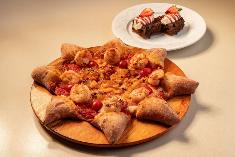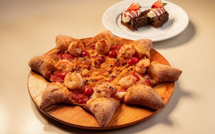 Pizza com camarão e chutney tropical, sobremesa de focaccia com mascarpone