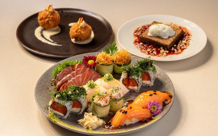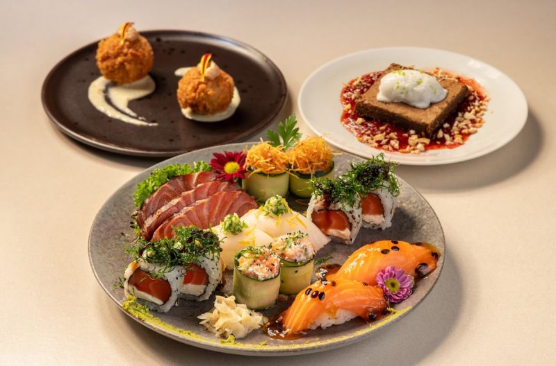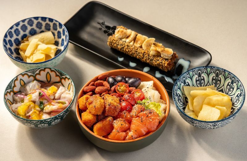 Ceviche, poke com salmão e lombo suíno, e sobremesa doce com banana
