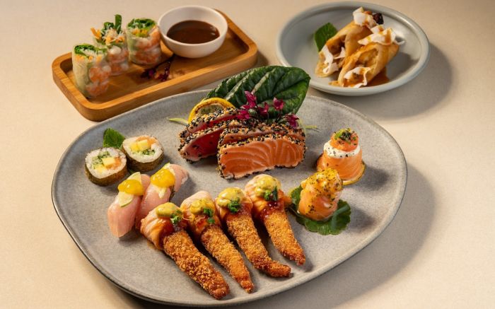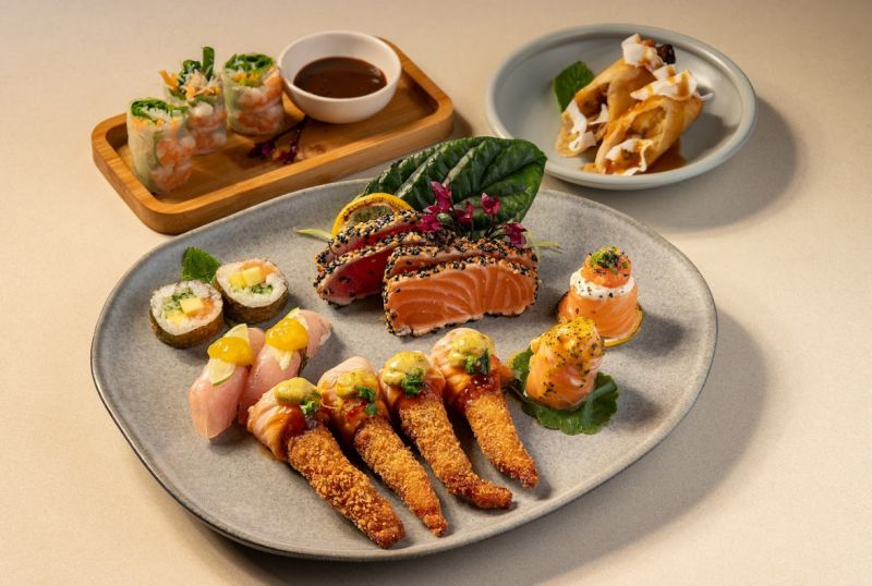 Goi cuon, combinado de sushis e sobremesa de banana com caramelo de missô.