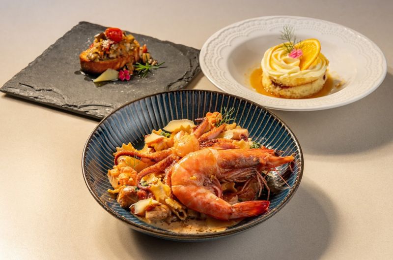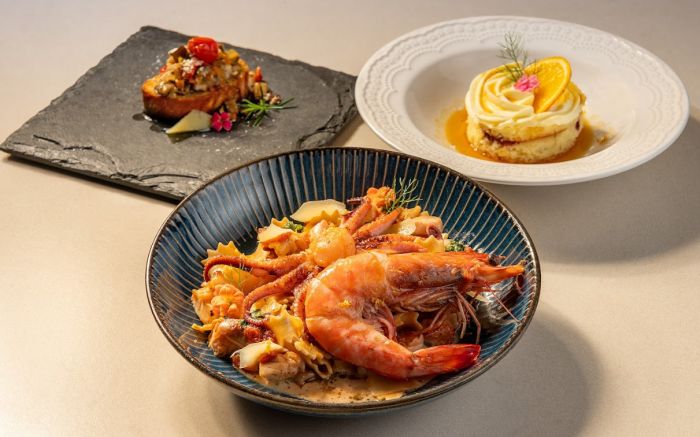 Bruschetta, massa com frutos do mar e sobremesa de bolo com sorvete