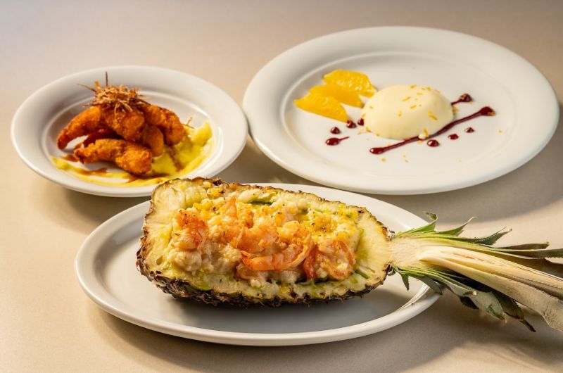 Camarão empanado, risoto servido no abacaxi e panacota com frutas