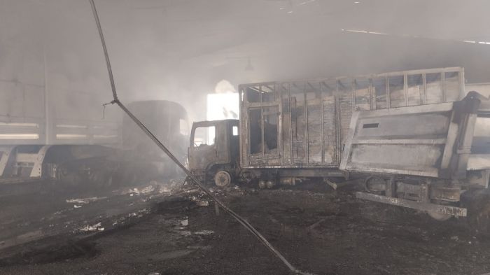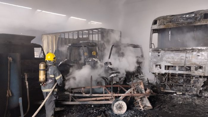 Chamas atingiram dois mil metros quadrados do galpão, destruindo caminhões e maquinário