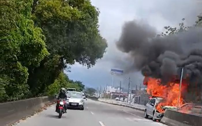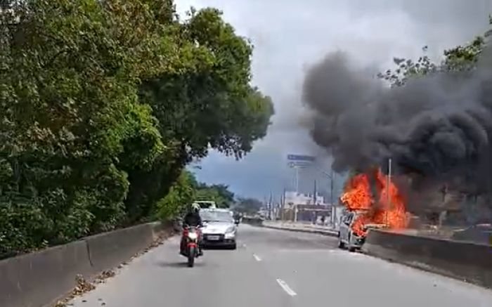 Carro pega fogo na via expressa portuária