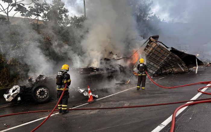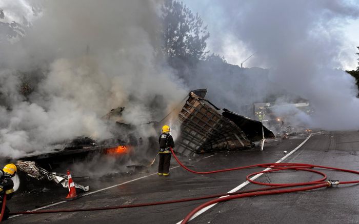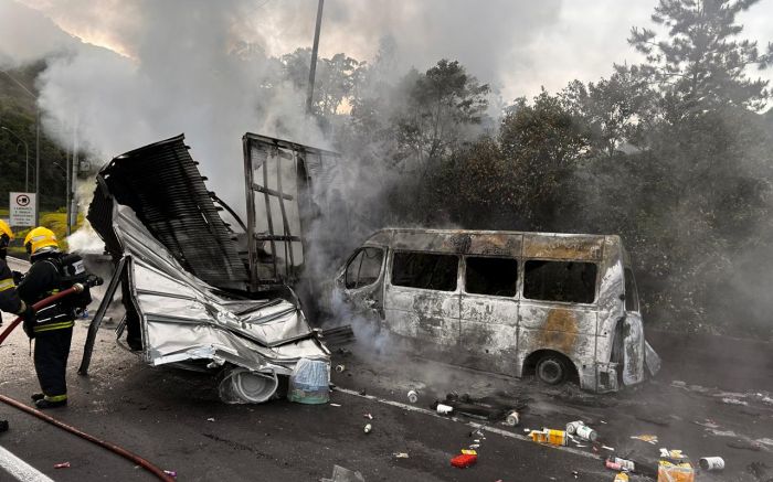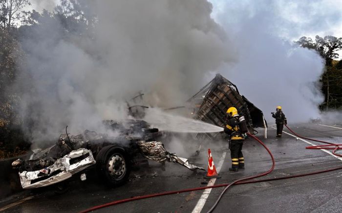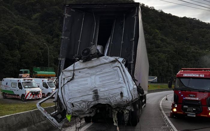 Com o impacto, o caminhão e a van ficaram totalmente em chamas. O motorista do primeiro caminhão morreu no local, preso às ferragens e esmagado dentro da cabine, que se desprendeu da carreta. O óbito foi confirmado pelo médico da Auto Pista Litoral Sul, e o corpo permaneceu no veículo até a chegada da perícia.