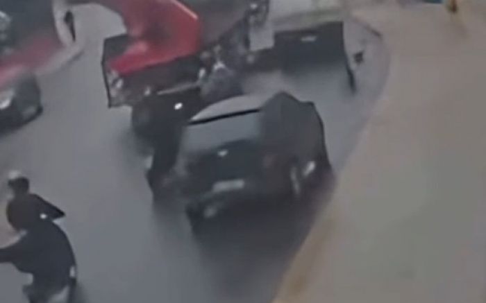 Ao escorregar, ele ainda tenta apoiar o pé no chão para se segurar, mas não consegue evitar a queda. Ele cai embaixo do veículo que estava à sua esquerda e acaba atingido pelas rodas traseiras do caminhão.