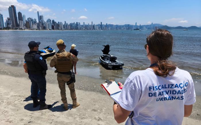 Uma operação batizada de Náutica Mais Segura foi feita neste sábado nas praias de Taquaras, Laranjeiras e na Praia Central, em Balneário Camboriú. A ação conjunta contou com a participação da Guarda Municipal, Polícia Militar e da equipe de Fiscalização de Obras e Atividades Urbanas. O objetivo foi brecar o uso irregular de motos aquáticas, os jet skis, e a atuação de empresas sem alvará, além de reforçar a segurança dos banhistas.