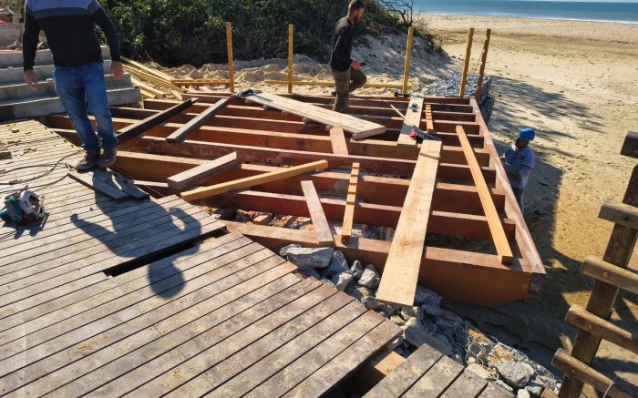 Com parte da tubulação passando sob a passarela da Lagoa do Cassino, a obra precisou abrir partes da estrutura. A substituição completa será feita no futuro, dentro do novo projeto de urbanização da orla, mas a associação realizou reparos emergenciais para garantir o uso seguro na temporada.