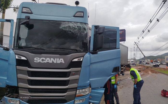 Um caminhão Scania saiu da pista e derrubou postes na rodovia Antônio Heil, no bairro Itaipava, em Itajaí, por volta das 13h de terça, no sentido Itajaí para Brusque. O acidente foi em frente à empresa Tecadi e Cantu Store, causando danos a quatro veículos que estavam estacionados nas duas empresas.