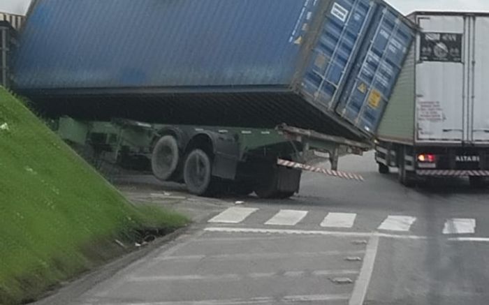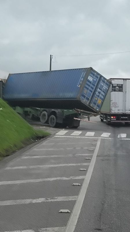Ainda na terça, outro caminhão se envolveu em acidente na BR 101, no viaduto do bairro Salseiros, em Itajaí. O veículo transportava um contêiner e acabou batendo na estrutura do viaduto. O motorista esqueceu que a altura do contêiner ultrapassava o limite permitido para passar sob a estrutura, que é de 3,4 metros. Com o impacto, o contêiner entalou e quase caiu da carroceria. A concessionária Arteris foi acionada pra atender o caso.