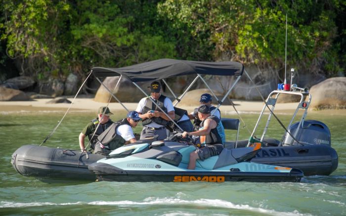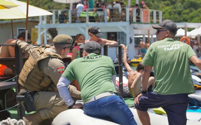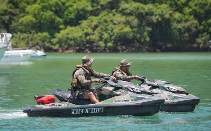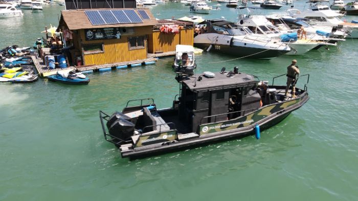 Como muita coisa acontece longe da areia, com embarcação fundeada no meio da baía, a fiscalização veio reforçada. A PM entrou com lancha, moto aquática e até helicóptero, garantindo que ninguém escapasse “só acelerando”.