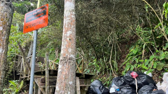 “Fomos à praia da Concha, que fica bem próxima ao morro do Careca. A praia está abandonada, com muito lixo no chão, lixeiras queimadas e a escada em péssimo estado. Grande parte caiu e fica bem difícil descer”, contou a denunciante ao DIARINHO.