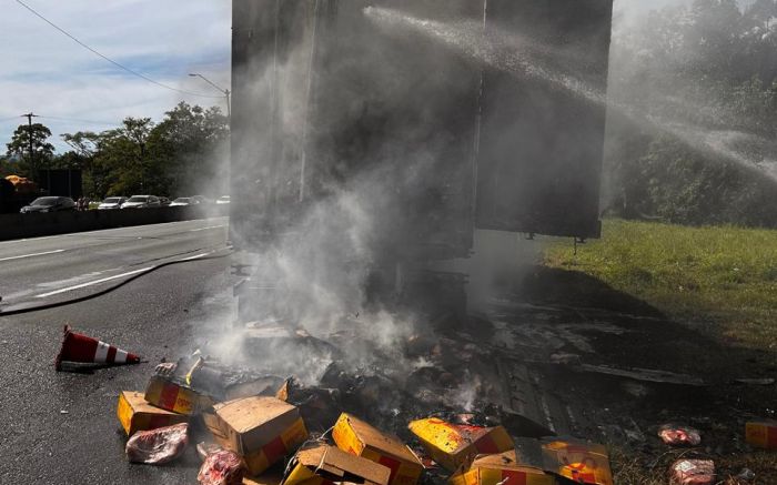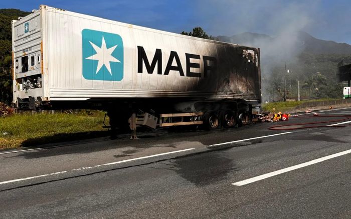 Uma carreta refrigerada, carregada com carne, pegou fogo na manhã deste domingo na BR 101, na praça de pedágio de Garuva, no norte de Santa Catarina.
