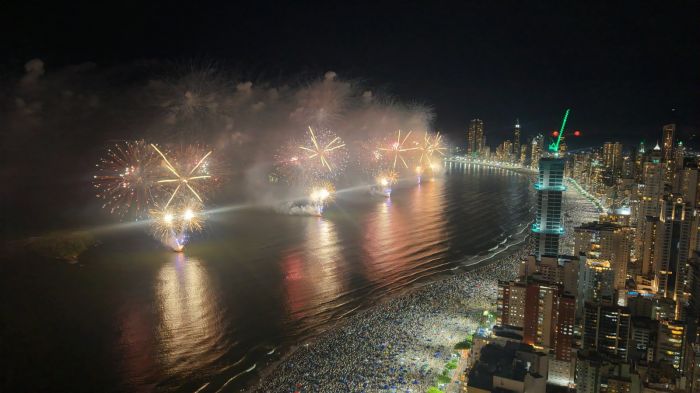Mais de um milhão de pessoas receberam 2026 nas areias da praia Central, um dos principais cartões-postais de Santa Catarina. Após a contagem regressiva na roda-gigante da Barra Norte, o público acompanhou 15 minutos de espetáculo pirotécnico com 16 tipos diferentes de fogos, com