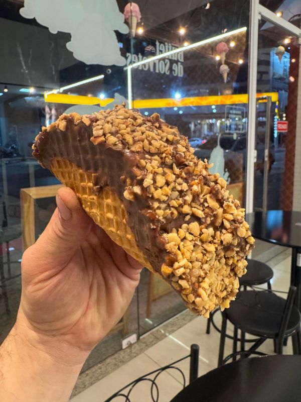 Entre as criações que mais chamam a atenção está o taco mexicano de sorvete. A sobremesa é feita com um waffle moldado em formato de taco, recheado com dois sabores de sorvete, cobertura e amendoim. A mistura do quente com o gelado conquistou o público rapidamente e virou um dos itens mais pedidos da casa.