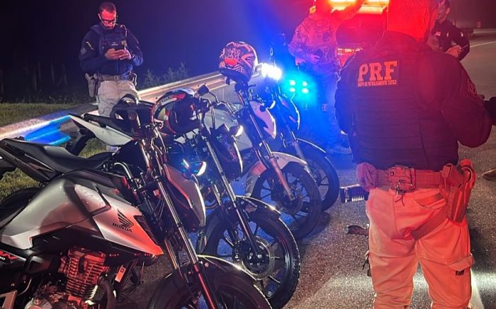 Um racha de motos foi interrompido pela Polícia Rodoviária Federal (PRF) na madrugada de domingo no Contorno da BR 101, em São José. A corporação recebeu uma denúncia sobre um bando que estaria praticando manobras arriscadas, como empinar motos e circular na contramão da rodovia.