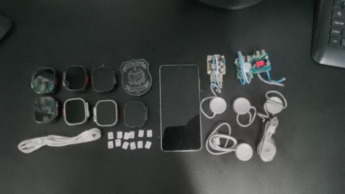 Com a descoberta, os policiais penais notaram que o suspeito usava gesso em uma das pernas. Ele passou pelo detector de metais, que indicou a presença de material metálico dentro do gesso. Os agentes retiraram o gesso e encontraram um verdadeiro carregamento que ele tentava levar para dentro do presídio: um celular, sete smartwatches, cinco carregadores por indução, duas placas de carregamento USB, um cabo USB e 12 chips telefônicos.